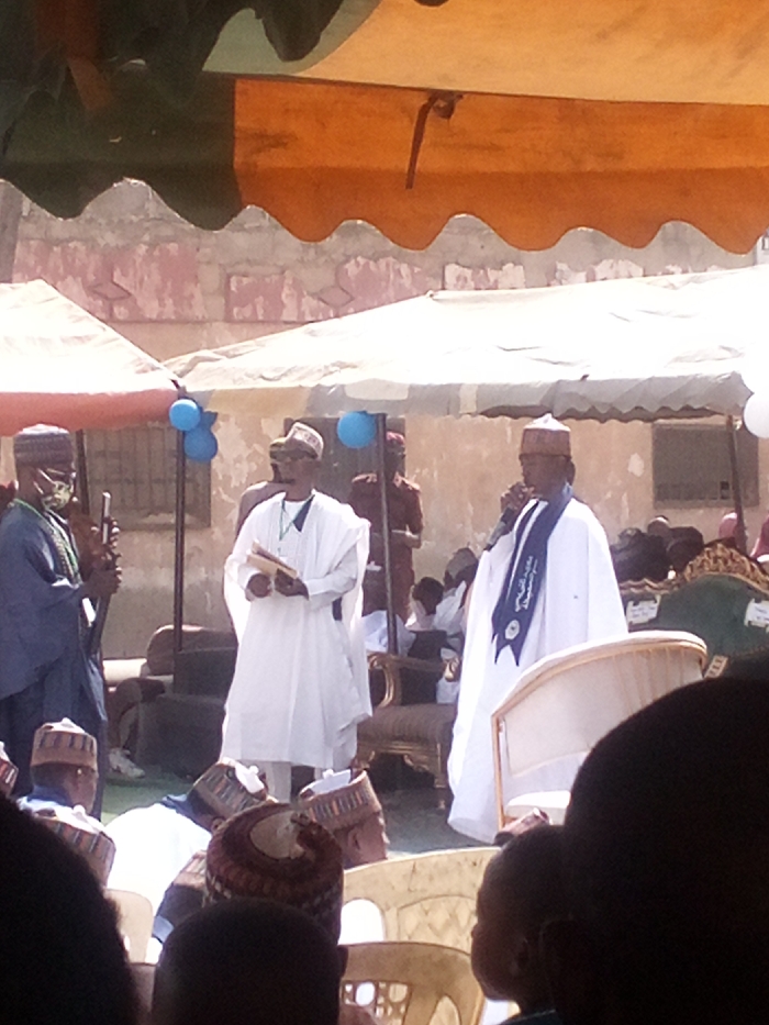 This image depicts an outdoor event in Tudun Wada, Nigeria, under bright daylight