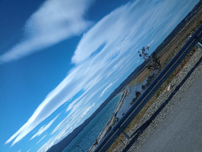 A skewed perspective shows a vibrant blue sky layered with streaking clouds. Below, a blue body of water stretches along a coastline with distant land. A road runs parallel, defined by a guardrail casting a stark shadow. A small, bare tree punctuates the space between the water and inland terrain, which features grassy and brown patches. The roadside appears to be gravel and pavement.