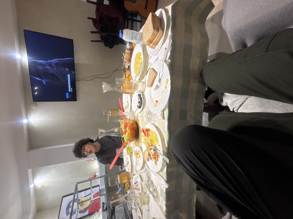 The image depicts an indoor dining scene in Sofia, Bulgaria, captured from a seated perspective at a table. In the immediate foreground, the legs of two individuals are visible; one person wears dark pants, and the other wears dark green pants with a gray blanket or garment. A rectangular dining table dominates the midground, covered with a light green and white checkered tablecloth. Numerous plates, many containing remnants of food, are scattered across the table. Specific food items include a glass bowl of salad (containing red and green vegetables), several slices of toasted bread on white plates, and a small dish of black olives. Various clear glasses and champagne flutes, some empty, some containing clear or amber-colored liquids, are present, along with two glass carafes filled with an amber beverage. Cutlery, including forks and knives, lies on or next to plates. A white plastic bottle with a blue lid is also on the table. Seated at the far side of the table, facing left, is a young male with dark, curly hair and glasses, wearing a dark long-sleeved shirt. He appears to be looking towards the left out of frame. The background reveals a light-colored wall illuminated by two ceiling-mounted spotlights. A flat-screen television is mounted on the wall, displaying an image of a person (possibly female) with the text "TRYING ON SHOES" and the YouTube logo visible. To the left of the seated male, a black metal shelving unit holds a framed piece of abstract, colorful artwork and other obscured items. To the right of the television, a dark wooden chair is partially visible, with a brown acoustic guitar resting against the wall beneath it. Cables run vertically down the wall from behind the television.