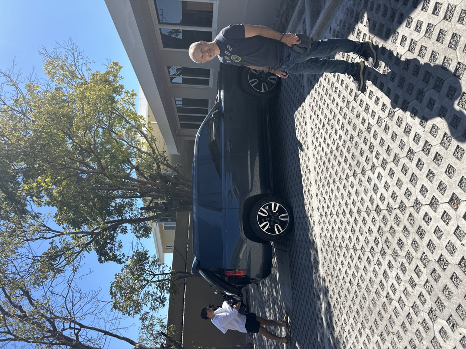 A rotated shot of a dark SUV parked on a patterned cement surface. An older man stands near the front passenger side of the vehicle, while a younger man stands behind it near an open door. Buildings are visible behind the car, with a blue sky and a tree branch framing the top of the image. The picture is somewhat underexposed, casting strong shadows on the ground.