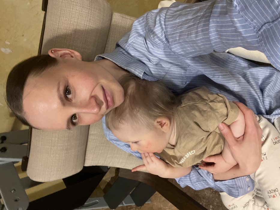 A woman with brown hair pulled back in a ponytail, wearing a blue striped shirt, holds a baby. The baby wears a brown shirt with "Never Perfect" printed on it and pajama pants with "I Love Daddy" written repeatedly. The woman smiles, looking toward the camera. They are sitting in an armchair with tan fabric. A metal mechanism is partially visible on the left side.