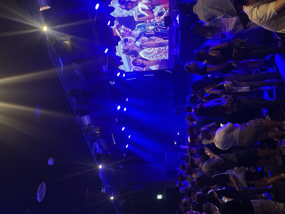 The image captures an indoor event venue in the city of Unknown, Unknown, with a large crowd of people gathered. The environment is dimly lit with dominant blue stage lighting emanating from fixtures mounted on the ceiling and stage structure. The ceiling, painted dark, contains recessed lights, several spotlights, and a white circular smoke detector. On the right side of the frame, a large LED screen displays a video featuring multiple individuals. One prominent figure on the screen wears a purple basketball jersey with "24" and a dollar sign chain, alongside another person with their tongue extended. Below the screen, a dark, elevated platform supports equipment, possibly a DJ booth. The crowd, consisting primarily of young adults, is densely packed, with many individuals holding and looking at their smartphones. An illuminated green exit sign is visible on a dark wall in the upper left quadrant. The scene depicts an active social gathering, likely a concert or club event.