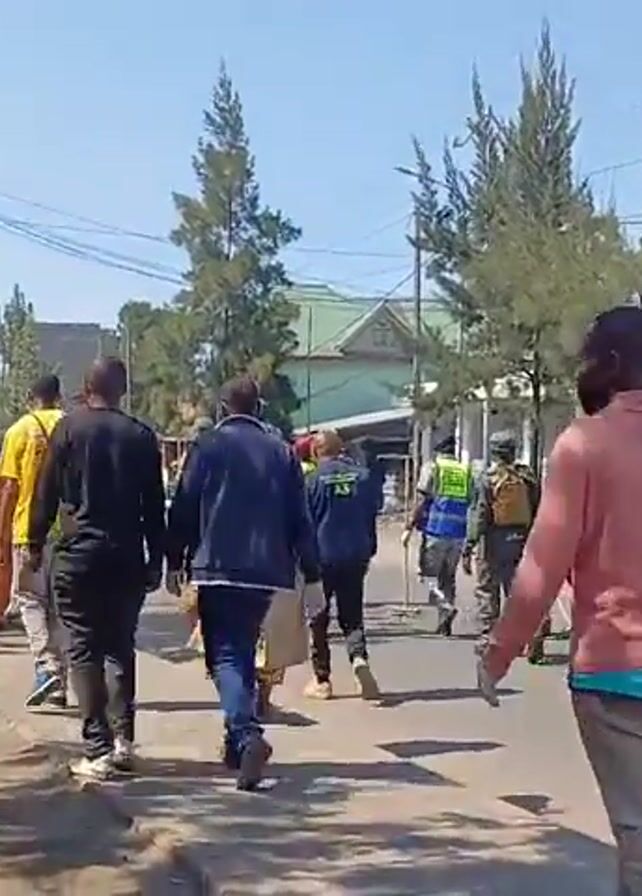 A group of people is walking along a street during the day. Some people are wearing high-visibility vests. There are buildings and trees on either side of the street. The sky is clear and blue.