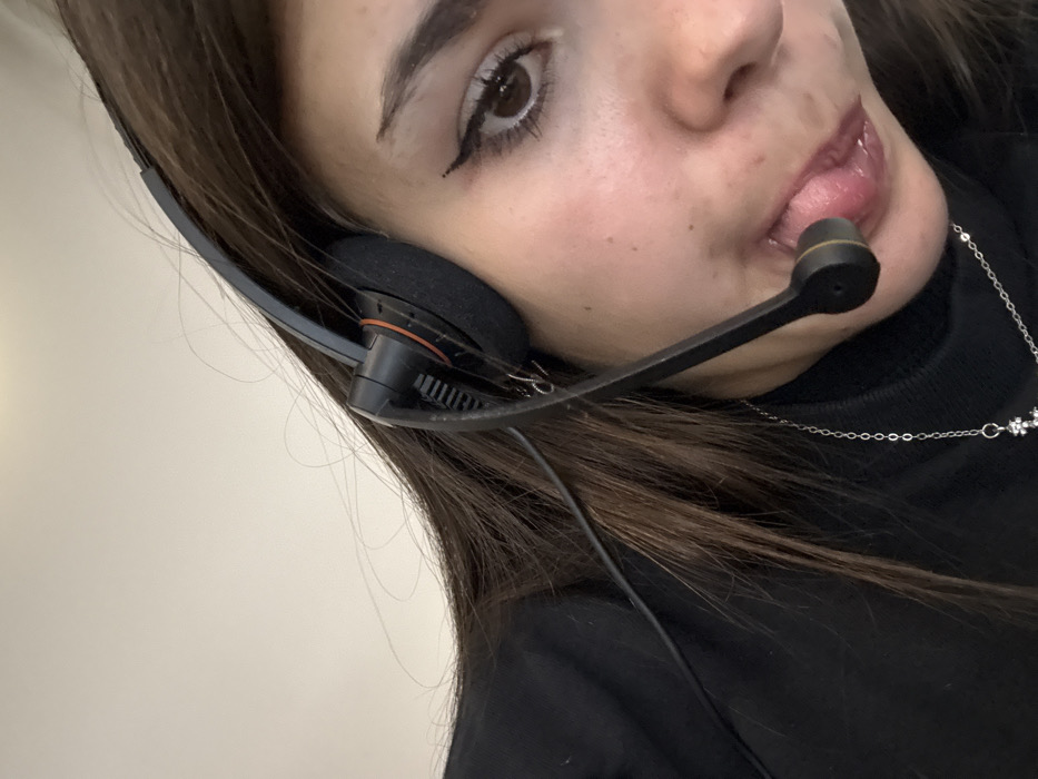A close-up, angled indoor photograph captures a person, likely female, from the upper chest upwards