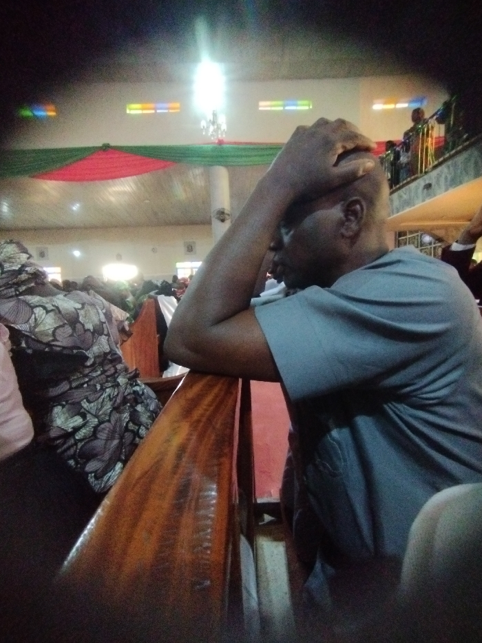A dark-skinned man in a gray shirt rests his head on his hand while sitting on a wooden pew. A woman in a floral patterned top is next to him. Behind them are more people sitting in the pews. A balcony with people on it is visible in the upper right. Decorations, including green, red, and white fabrics are hung from the ceiling. Colored stained-glass windows are on the upper wall and a chandelier provides light.