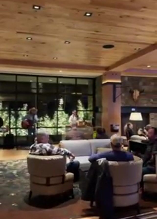 well-lit hotel lobby with a live music performance. People are seated in comfortable armchairs and sofas, casually listening to the musicians. The lobby has a rustic-chic design with wooden ceiling panels, stone pillars, and large windows overlooking greenery. A bar area with illuminated shelves and bottles is visible in the background. The camera briefly pans around the lobby before moving towards a hallway with dark blue walls and a TV screen.