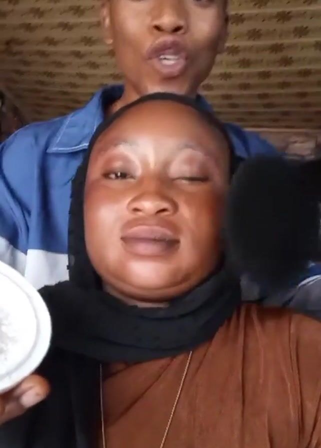 A man in a blue shirt is applying makeup to a woman wearing a headscarf. The man is standing behind the woman, holding a white container in one hand and a makeup brush in the other. He is brushing makeup on the woman's face. The woman is looking at the camera and smiling. The background includes a wall with a patterned wallpaper, a fan, and a display cabinet. The man says, "You must look good. You must look good."
