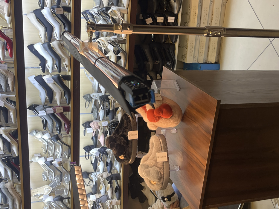 The image depicts the interior of a shoe store located in Al-Midan Municipality, Syria