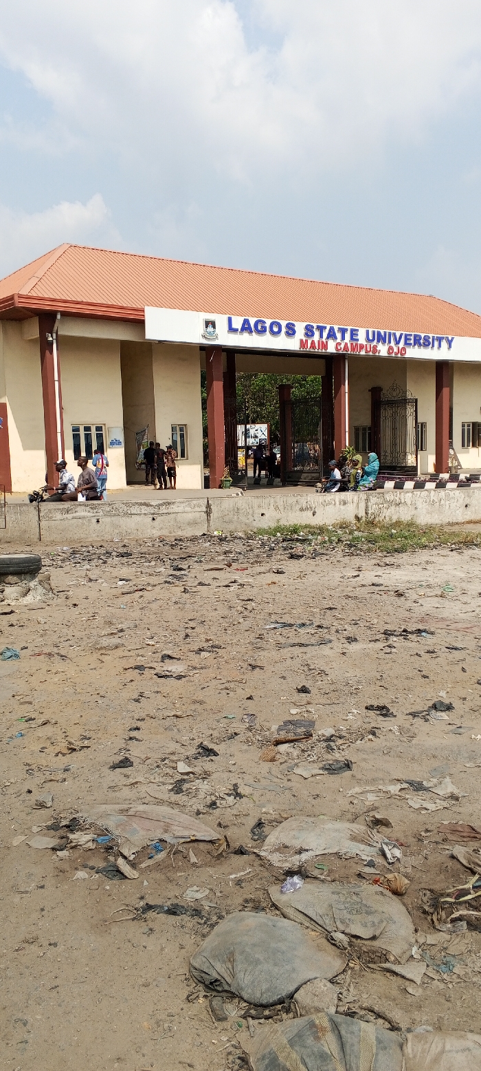 The image depicts the main entrance of Lagos State University, Main Campus, Ojo, situated in Awjaw, Nigeria, under a bright, partly cloudy sky