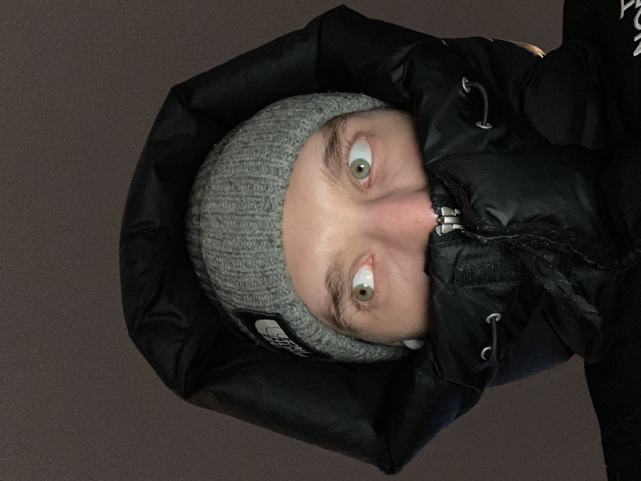 A person wearing a gray beanie and a black puffer jacket with the hood up stares intently at the viewer. The jacket is zipped up to the chin, obscuring the lower half of the face. The person's eyes are wide and light green. The image is rotated, giving the impression of looking up at the subject from a low angle. The background is dark and indistinct.