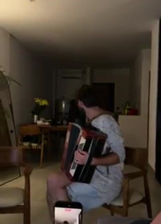 man sitting in a chair and playing an accordion. The accordion is red and black. He is wearing a light-colored shirt and shorts. The room appears to be a living room, with a table, chairs, and a plant visible. Someone is recording the man with their smartphone. The room is dimly lit.