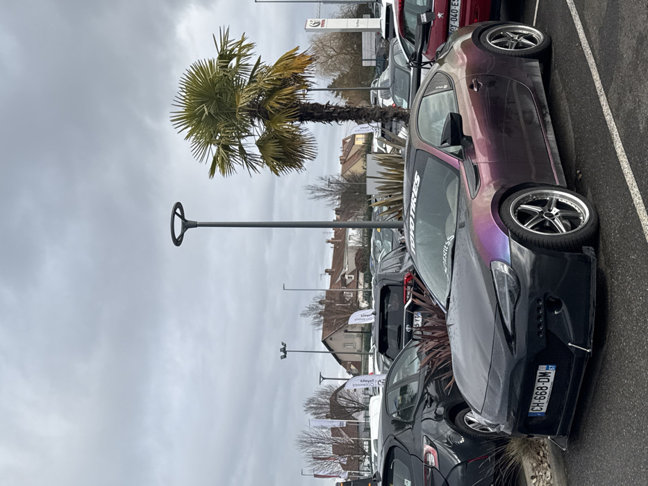 This image depicts a static scene within an outdoor parking lot, likely a car dealership, in Hoenheim, France, under an overcast sky