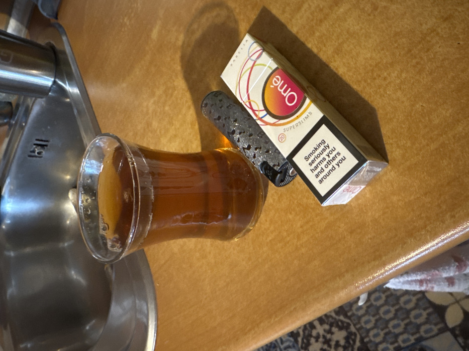 The image depicts an indoor scene on a light brown, possibly laminate, countertop in what appears to be a kitchen or utility area in Novi Pazar, Bulgaria. In the foreground, a clear, stemmed glass containing a dark amber liquid, likely tea, is positioned to the left. To its right, a dark, textured lighter rests beside a white cigarette pack. The cigarette pack is branded "Omé SUPERSLIMS" with "KARELIA" visible, and displays a prominent warning label stating, "Smoking seriously harms you and others around you." The pack appears sealed in cellophane. In the background, a stainless steel kitchen sink is partially visible, with a metal faucet component also present. A patterned towel, white with faint reddish stripes, hangs over the edge of the countertop in the lower-left corner. Below the countertop and to the left, a section of floor or wall with blue and grey geometric patterned tiles is discernible. No individuals are present in the scene, and the objects are static under an apparent light source casting shadows to the right.