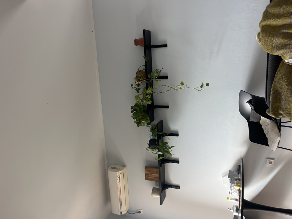 The scene depicts a section of an interior living space in Budva, Montenegro. The upper half of the frame features a pale blue ceiling meeting light-colored walls. On the left, a white wall-mounted air conditioning unit is installed near the ceiling, with a dark power cable extending downwards to a white electrical outlet. To the right, three distinct black floating shelves are affixed to the wall. The leftmost shelf holds a light-colored ceramic cup and a rectangular wooden block. The middle shelf displays several potted plants, one with prominent long, trailing green vines extending downwards. The rightmost shelf contains a single reddish-brown ceramic pot. In the lower left quadrant, a portion of a black circular table with a central pedestal leg is visible, holding a clear glass container, a small bottle, a white tissue box, and other indistinct items. Centrally, a black chair with a modern, shell-like design and a light-colored cushion is positioned. Below the middle shelf, an additional white electrical outlet is present on the wall. On the far right, a segment of a dark sofa or armchair is visible, draped with a textured yellow-green throw blanket. No individuals are present in the image.