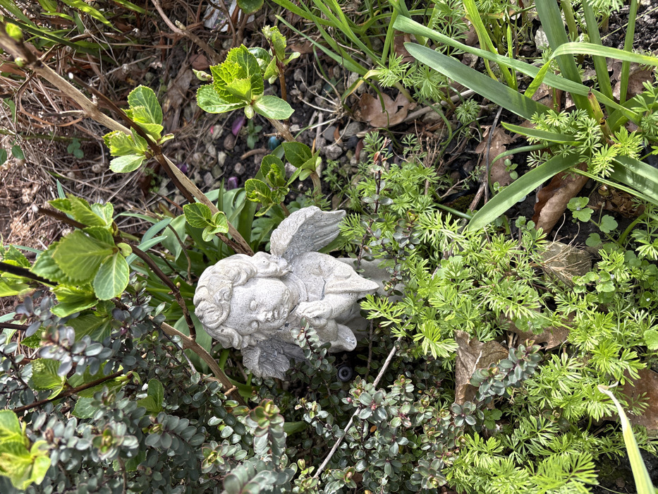 A weathered grey stone statue of a cherub, featuring wings and hands clasped in prayer, is positioned within a garden bed in the city of Minsterley, United Kingdom. The cherub is partially enveloped by varied green foliage. Dark green, small-leaved shrubs are visible to its left and behind it. To its right and further back, new light green leaves emerge from bare branches. The foreground and areas around the cherub's base are covered by bright green, finely-divided ground foliage, interspersed with longer green blades. The underlying ground consists of dark soil, small stones, scattered brown dried leaves, and a few small, colored pebbles, including a purple one visible near the top right of the cherub's head. The scene is illuminated by diffuse daylight.