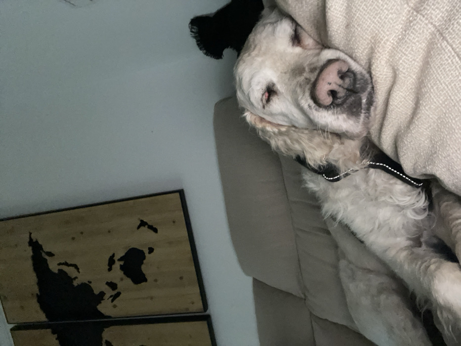 The scene is an indoor environment within the city of Torrelodones, Spain. A light-colored, long-haired dog is observed sleeping on a tan upholstered sofa. The dog is positioned on its side, with its head resting on a light brown textured pillow. Its eyes are closed, revealing a pinkish inner eyelid margin. A black collar featuring white reflective stitching is visible around its neck. The background consists of a plain white wall, adorned with two rectangular wooden wall hangings. Each hanging displays black silhouettes of landmasses; the visible portions clearly show Australia and New Zealand against a light wood-grain panel. No human subjects are visible in the frame.