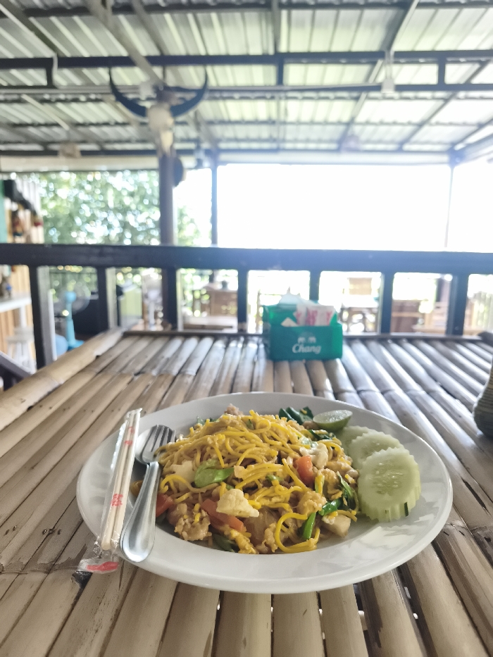 The image depicts a meal served on a bamboo-slat table at an outdoor or semi-outdoor dining establishment in Baan Hua Thanon, Thailand