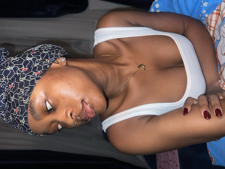 A woman with dark hair wrapped in a patterned headscarf, and a gold necklace with a crescent moon pendant, lies on her side. She wears a white tank top revealing cleavage. Her skin is glossy and her lips are slightly parted. Her nails are painted dark red. She rests one arm on a colorful blanket or bedding.