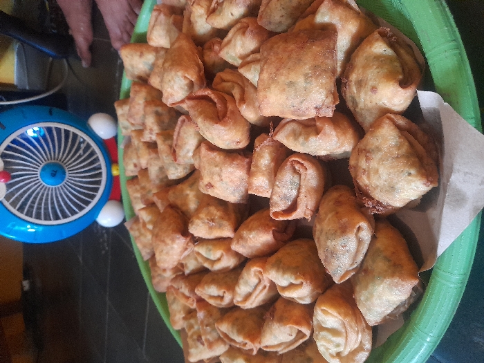 - "A large green tray overflows with golden-brown fried dumplings" by FM-p15wb2, licensed under CC BY 4.0