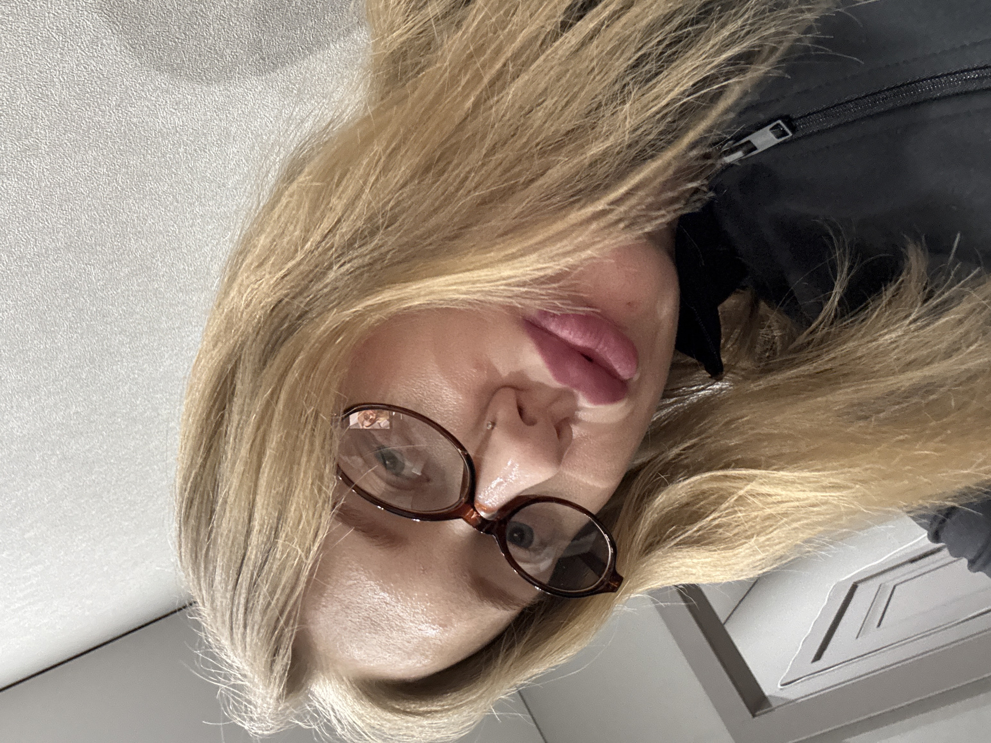A woman with blond hair and glasses is looking down at the camera