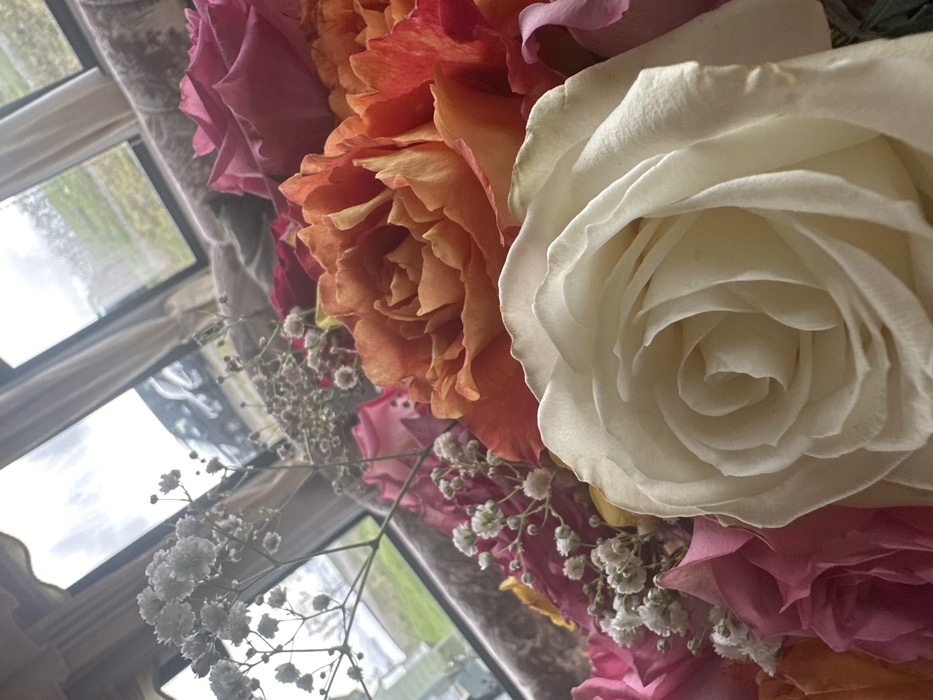 The image depicts a multi-colored floral bouquet located indoors in Fowlis Easter, United Kingdom. The bouquet features a prominent white rose in the foreground, surrounded by roses in shades of orange, peach, various pinks, and red. Small clusters of white baby's breath are distributed throughout the arrangement. The flowers rest on an upholstered surface with a discernible pattern. Behind the bouquet, a multi-paned window reveals an outdoor environment under an overcast sky. A green, grassy area is visible through the window, and a dark-colored vehicle is partially observable in the distance. Light-colored curtains are present on the window frame. No individuals are visible, and no actions or interactions are occurring within the static scene.