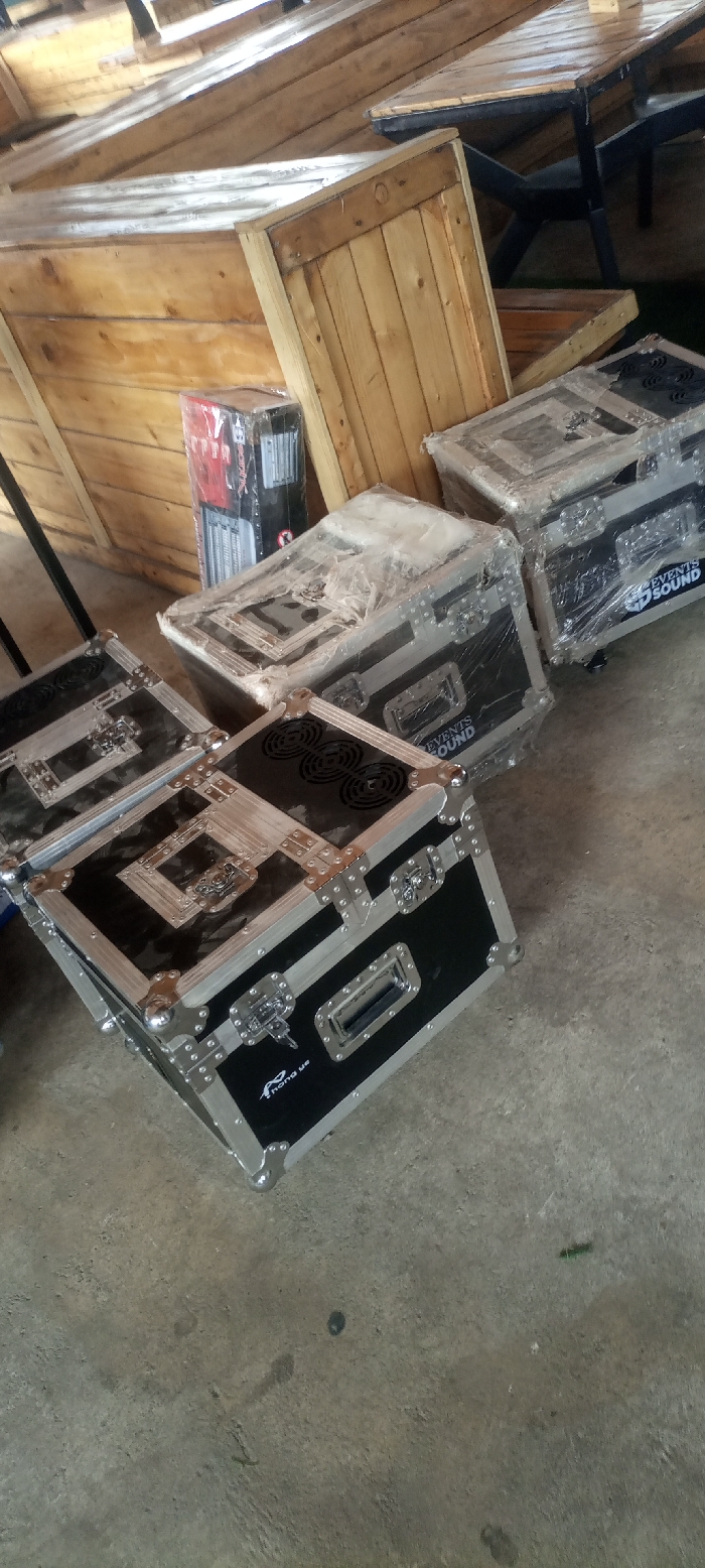 The scene depicts a concrete floor area in the city of Unknown, Unknown. Four black and silver flight cases, commonly used for event equipment, are positioned on the floor. Three of these cases are partially covered in clear plastic wrap. The case in the foreground features three circular grilles on its top surface and a logo displaying "zhong us" (stylized text). Two cases further back show visible branding, including "GP EVENTS SOUND". In the background, a large structure constructed from horizontal wooden planks serves as a counter or partition. Adjacent to this wooden structure, a tall, rectangular item, possibly an electronic component or speaker, is visible, enclosed in clear plastic and black packaging. A wooden table with a dark metal frame is partially visible behind the main wooden structure. The lighting suggests an indoor or sheltered setting. No individuals are present in the image.