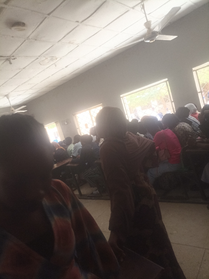 The image depicts an indoor scene resembling a classroom or lecture hall, located in the city of Unknown, Unknown. The room contains a large group of individuals, estimated at 20-30, primarily seated in rows of desks or benches. The environment features a light-colored ceiling with visible grid patterns and at least two ceiling fans. Multiple large windows fitted with grilles are present on the far wall, admitting bright natural light and revealing foliage outside. The walls are light grey or off-white. In the foreground, the left shoulder and head of an individual wearing a multi-colored garment (orange, blue, white pattern) are visible, partially obscuring the scene. In the middle ground, a person stands in an aisle, facing away from the camera, wearing dark, patterned clothing and a head covering. The seated individuals, occupying the rows of furniture, display varied attire, including shirts, head coverings, and shawls, in colors such as red, light blue, and various patterns. Most appear to be facing towards the left side of the frame. No specific actions or interactions beyond passive presence are clearly discernible.