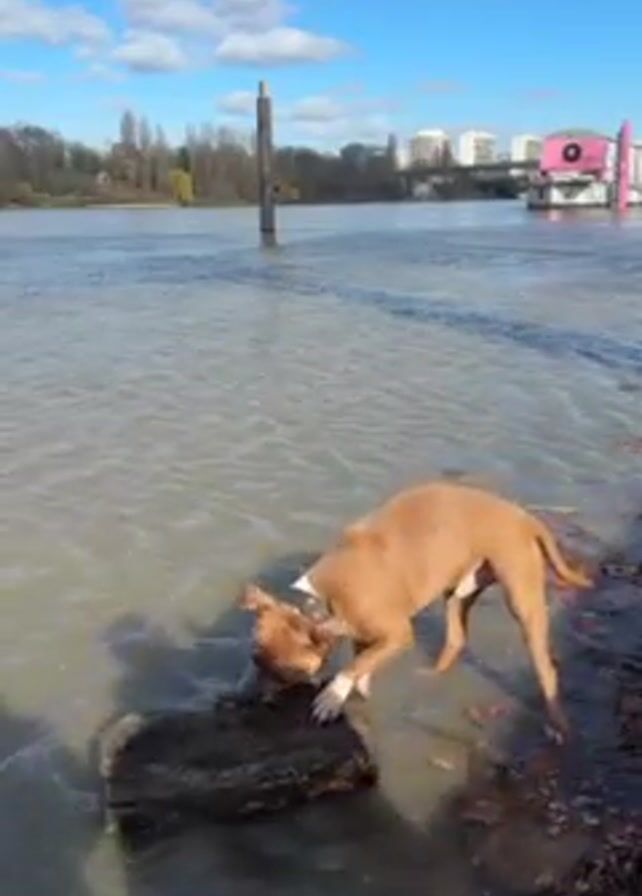 A dog stands in shallow water, tugging at a piece of wood. The dog is brown with white paws and wears a studded collar. It is standing on a muddy bank beside a body of water on a sunny day with a few clouds in the sky. In the distance, there are some buildings and trees.