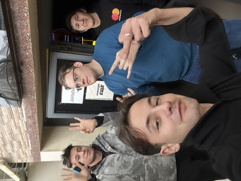 Four males are captured in a selfie-style photograph taken outside a building entrance in Tashkent, Uzbekistan