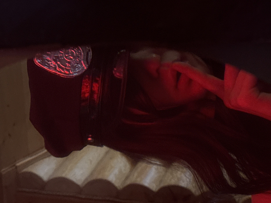 The image portrays a female individual located indoors in Toksovo, Russia, under intense red lighting that casts deep shadows