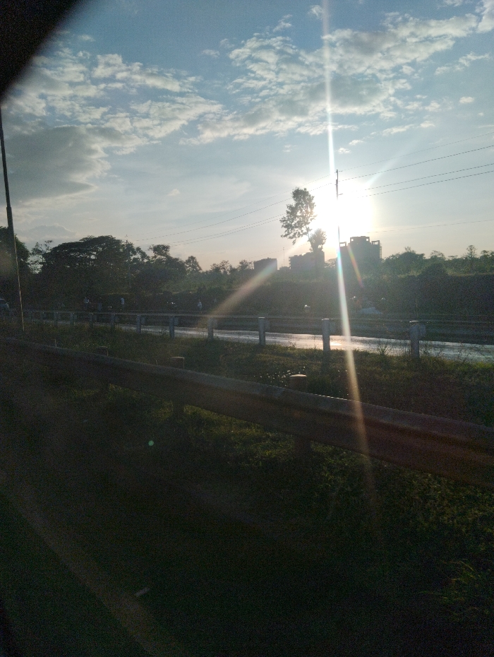A low-angle photograph depicts an outdoor scene in Thika Township ward, Kenya, characterized by strong backlighting from a prominent sun. The sun, located in the upper-right quadrant, casts a bright, vertical lens flare across the frame, obscuring details. The sky above is light blue with scattered white, cumulus clouds. In the foreground, a dark, weathered metal crash barrier (guardrail) runs horizontally across the lower portion of the image, partially obscuring a grassy verge. Beyond the barrier, a paved road surface, appearing reflective due to the direct sunlight, is visible. Several small, indistinct human figures are positioned along the road's edge or shoulder, appearing to be standing or walking. The midground features dense green vegetation, including trees and bushes, which are partially silhouetted against the bright background. Utility poles with overhead power lines are discernible in the middle distance, extending horizontally across the sky. In the background, a dense treeline forms a dark silhouette against the sky. Several distant, dark building structures are visible just above the horizon, silhouetted against the intense light of the sun. The overall lighting conditions suggest either sunrise or sunset.
