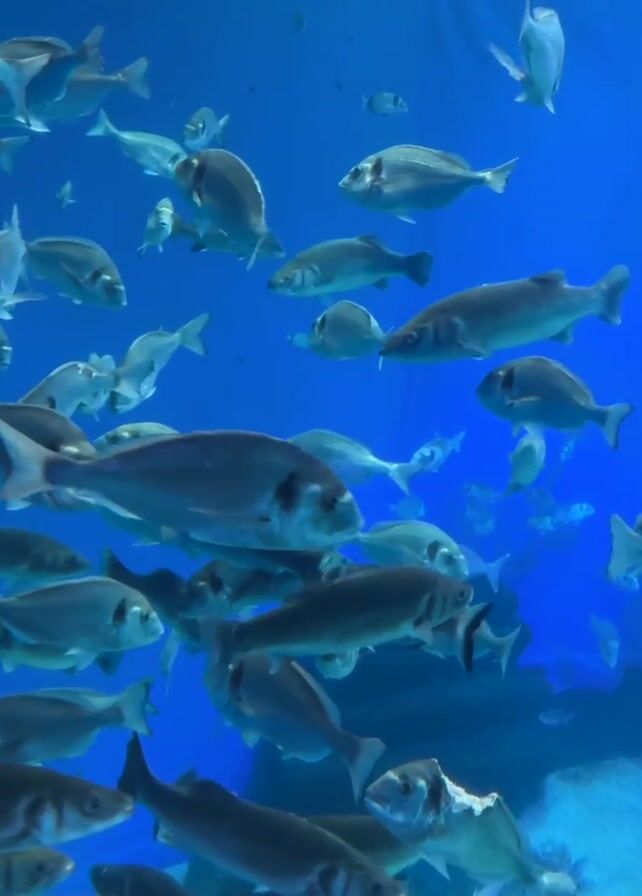 large aquarium filled with many fish swimming in blue water