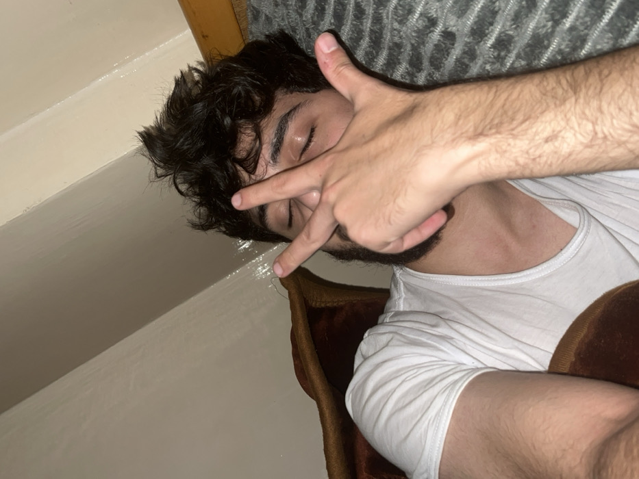 A young man with dark hair and a beard is lying down, possibly in bed or on a couch. He is wearing a white t-shirt. His eyes are closed, and his hand is raised, making a peace sign over his face. The background shows a light-colored wall and some furniture, including what looks like a headboard or pillow with a textured gray fabric. The lighting is somewhat dim, creating shadows in the image.