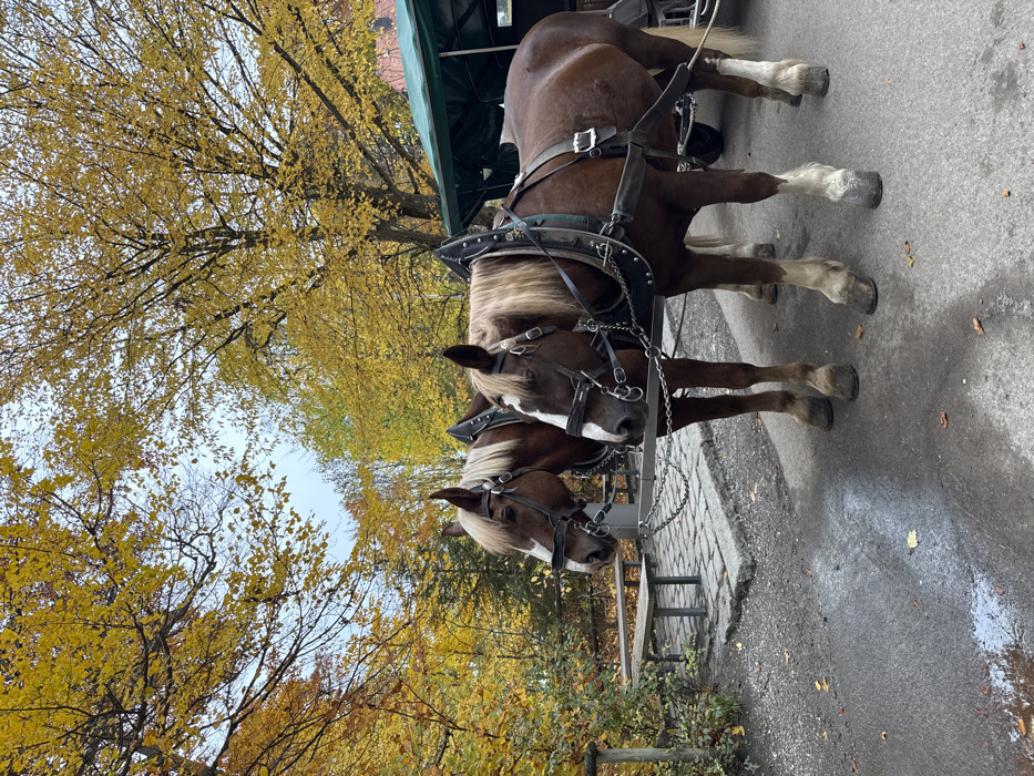 - "In Schwangau, Germany, two brown draft horses stand harnessed to a passenger carriage on a wet asphalt road during autumn" by FM-jEBFN2, licensed under CC BY 4.0