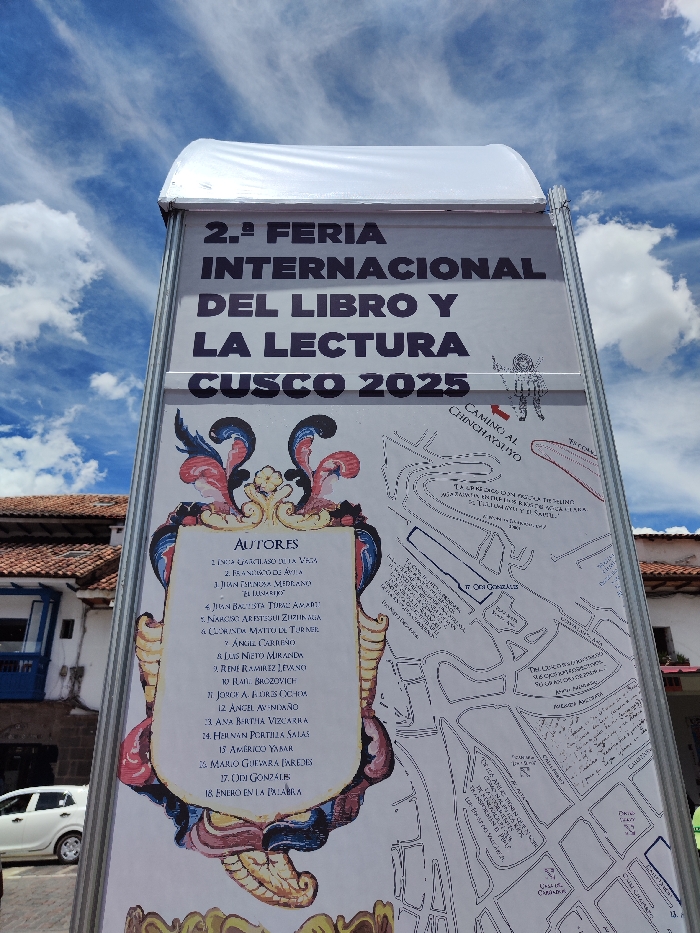 A large, vertical promotional sign for the "2.a FERIA INTERNACIONAL DEL LIBRO Y LA LECTURA CUSCO 2025" (2nd International Book and Reading Fair Cuzco 2025) dominates the center of the frame, set outdoors under a bright blue sky with scattered white clouds. The white banner, supported by a metallic framework and topped with a white semi-circular tent roof, features large dark sans-serif text identifying the event. Below the title, the left side displays a decorative, multi-colored baroque-style frame enclosing a numbered list of at least 18 "AUTORES" (Authors). The right side presents a hand-drawn-style map, likely of the city of Cuzco, detailing street layouts and points such as "CAMINO AL CHINCHAYSUYO," with a small stick-figure-like illustration near the event year. In the background, traditional architecture with terracotta tile roofs, light-colored walls, and a blue balcony is visible on the left, while similar building elements appear on the right. A white compact car is partially visible behind the lower-left section of the sign. The scene is situated in the city of Cuzco, Peru.