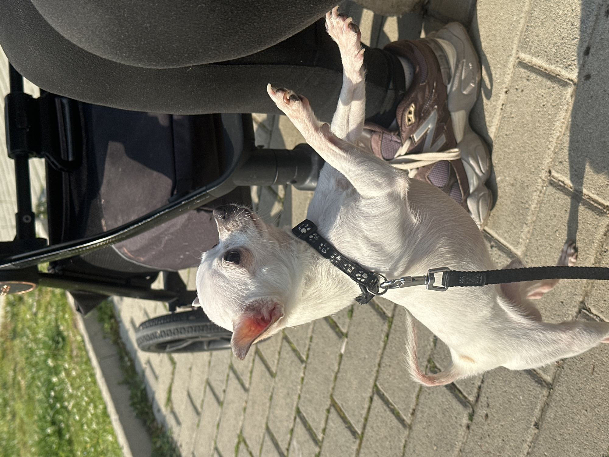A small, white chihuahua with a black collar and leash is lying on its back on a gray brick sidewalk in Sliven, Bulgaria. The dog's paws are in the air, near a person wearing black leggings and brown New Balance sneakers. A black stroller is partially visible to the left of the dog and person. The background includes grass and paving stones, and the scene is illuminated by bright sunlight.