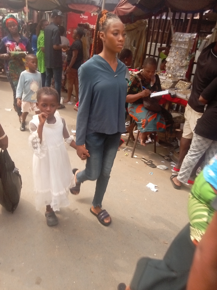 The image depicts a crowded outdoor market street in Fegge, Nigeria. In the foreground, a young female, approximately late teens to early twenties, with braided hair featuring orange highlights, walks while holding the hand of a young child. The female wears a teal long-sleeved v-neck top, distressed blue jeans, and dark slide sandals with purple stripes. She looks towards the right of the frame. The child, approximately 3-5 years old, wears a white, layered dress with lace detailing on the sleeves and dark sandals. The child's left hand is near its mouth, and it looks directly forward. The street is a paved surface with scattered litter, including small white paper scraps. In the mid-ground, to the right, an adult female with braided hair sits on a low stool behind a table laden with jewelry and small metallic items for sale. She wears a patterned garment and is actively writing on a white notepad with a blue pen. Overhead, market stalls are covered by dark tarpaulin awnings. Multiple other individuals populate the background, some walking, others stationary near various stalls displaying goods. A red sign with the word "Zinox" is partially visible in the upper mid-ground. A young boy in a light blue shirt is visible behind the walking child in the foreground. The overall scene indicates a bustling commercial area under natural light.