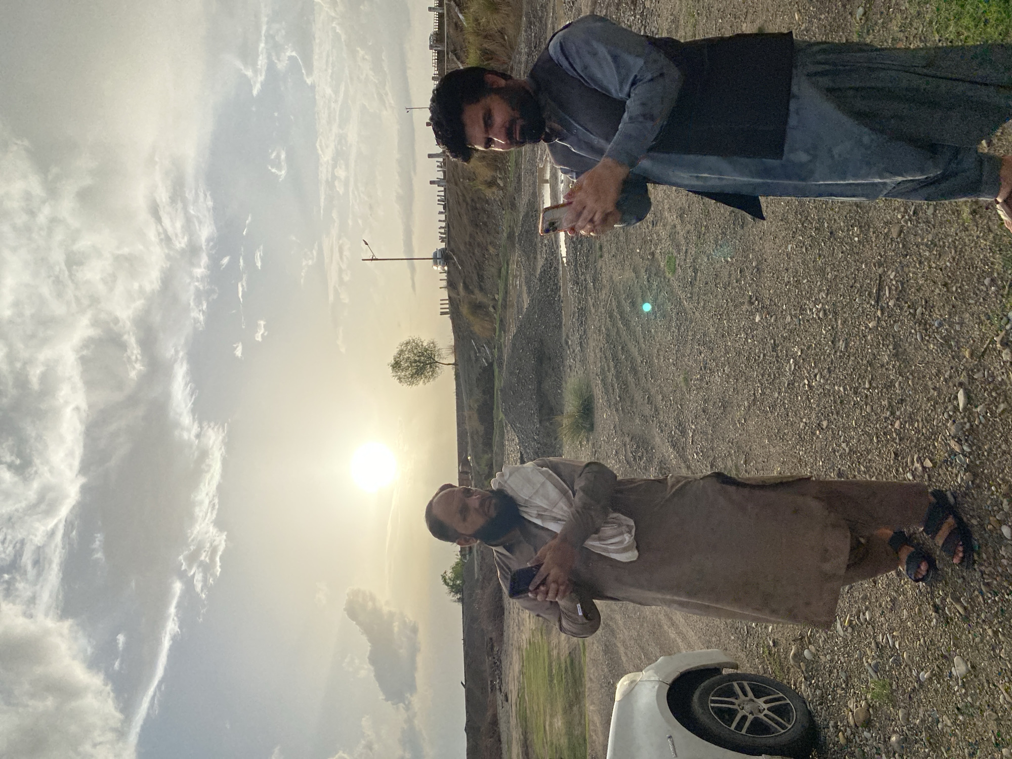 An outdoor scene in Arghandab, Afghanistan, features two adult males on a gravel-dirt surface under a partially cloudy, golden-hour sky. The man on the left, with a dark beard, wears a brown traditional outfit and dark sandals. He holds a dark smartphone with both hands and looks down at the screen. A white cloth is draped over his left shoulder. The front portion of a white car, specifically the driver's side front wheel and fender, is visible next to him on the far left. The man on the right, also with a dark beard, wears a grey traditional outfit, a black vest, and brown sandals. He holds a light-colored smartphone with both hands, oriented horizontally, and looks forward towards the viewer. In the background, an elevated dirt embankment supports a road marked by numerous vertical white and dark posts. A solitary tree stands on the left side of this embankment. Further right along the embankment, a street light pole is visible. The ground between the men and the embankment contains scattered piles of gravel and small puddles of water. The setting sun is low on the horizon to the left, casting a warm light.