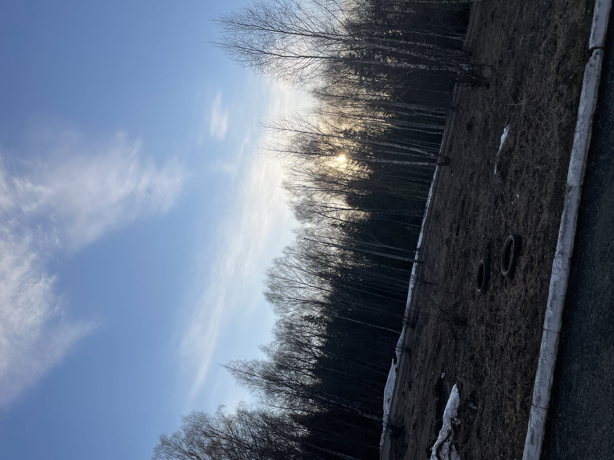 The image depicts a landscape with a focus on natural elements. A clear, light blue sky with wispy white clouds occupies the upper left portion of the frame. A dense row of bare trees without leaves stretches across the middle ground, obscuring the horizon with some sunlight penetrating through the trees. The foreground consists of a grassy slope, predominantly brown and dry with patches of white, presumably snow or ice. Two dark, circular objects are visible on the slope, possibly tires. Adjacent to the slope is a section of what appears to be a paved surface, bordered by a concrete curb. The image provides no information about the city Марковский, Russia.