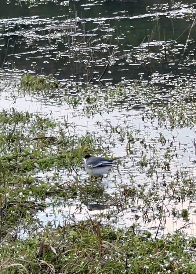 bird, likely a white wagtail, standing in shallow water on the edge of a lake or pond. The bird has a gray body with a white belly and face, and a black cap. It is surrounded by green vegetation and small white flowers growing in the water. The water's surface is covered in small white specks, possibly reflections of light. In the background, the opposite shore of the water body is visible, appearing dark and blurry. The camera is static and captures the bird in its natural environment, focusing on its movement and interaction with the surrounding vegetation. The scene suggests a natural, undisturbed environment, with the bird as the main subject of interest.