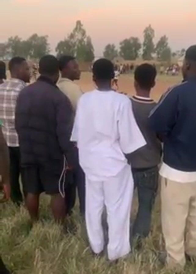 A group of at least eight people watch a sports game in the distance