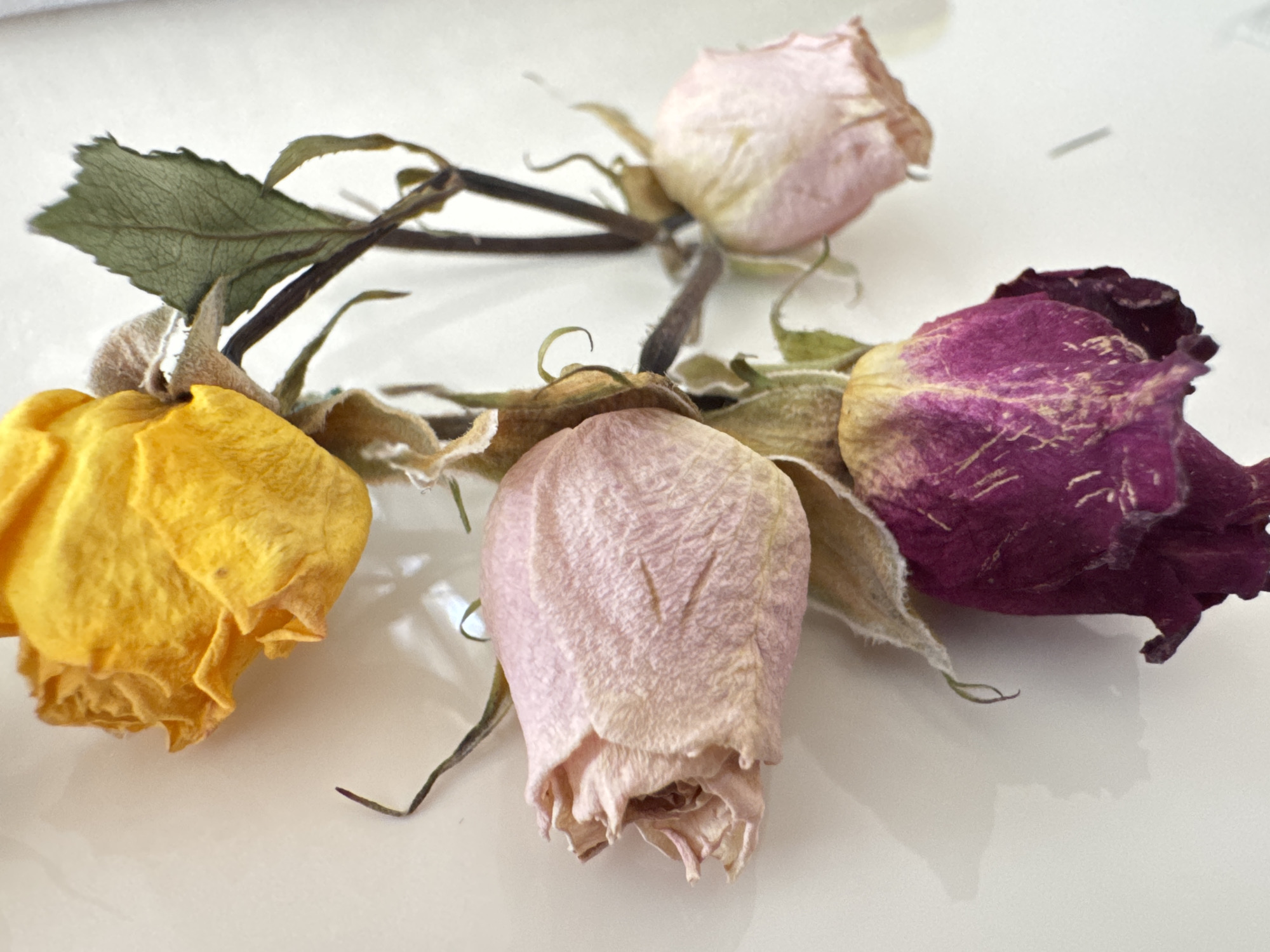 four dried roses of different colors (yellow, light pink, dark pink/purple, and white/light pink). They appear to be lying on a white, reflective surface. One rose has a green leaf attached. The location is not discernible from the image.