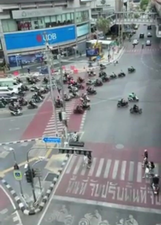 n aerial view of a busy intersection in a city, presumably in Thailand based on the presence of Thai writing on the crosswalk