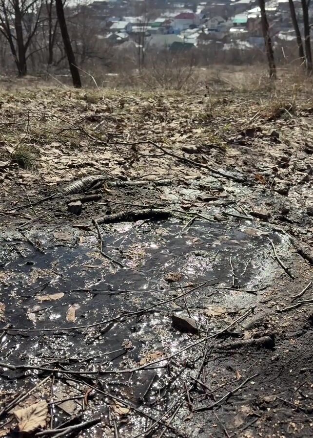 The scene is a muddy patch of ground in a park or wooded area, possibly in early spring, with a distant view of a small town or village. The ground is covered with dead leaves, small twigs, and damp soil, with a puddle of water reflecting sunlight. The water is dark and murky, with twigs and leaf fragments floating within. In the background, bare trees frame a view of a cluster of houses and buildings, giving a glimpse of urban life beyond the natural setting. The sky is partially visible, with a light blue color suggesting a clear day. The foreground is dimly lit, while the background appears brighter. The shot is taken from a low angle, emphasizing the texture and details of the ground and the surrounding environment.