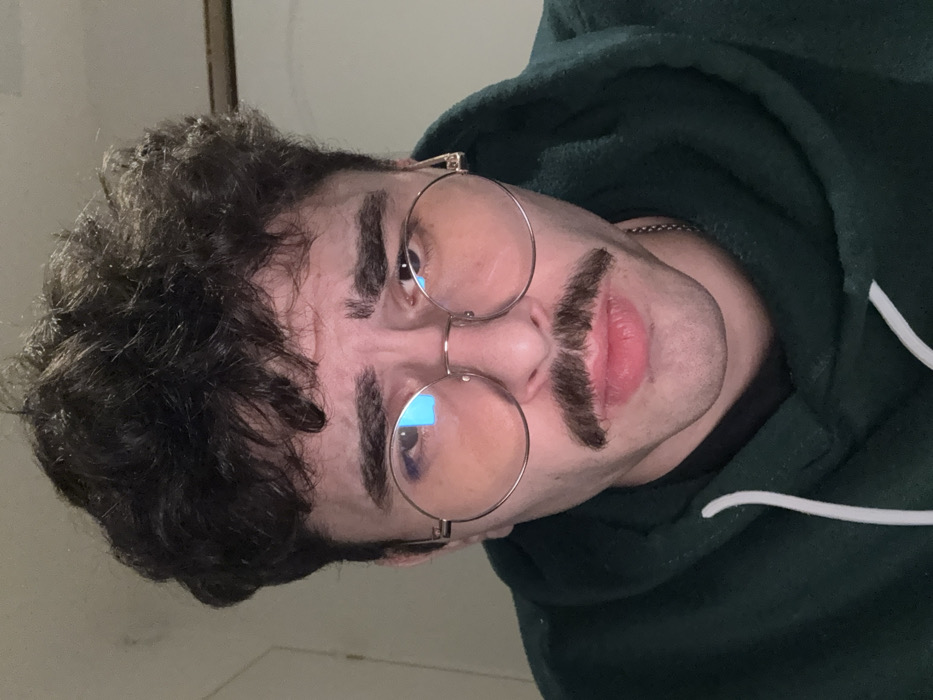 A man with dark, curly hair and thick eyebrows wears round-rimmed glasses and a green hoodie. He's turned at an angle, looking directly at the camera. A digitally added, cartoonish, dark brown mustache sits just above his upper lip. The background is a plain, light-colored wall. The image appears to be a selfie.