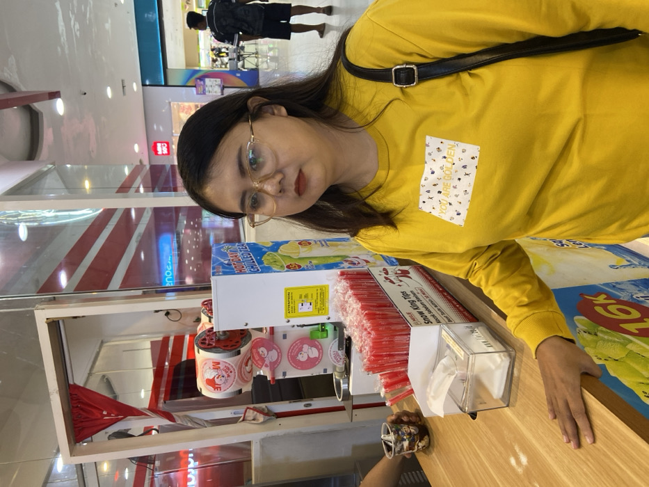 The image depicts a scene inside a shopping mall in Sidoarjo, Indonesia. In the foreground, a woman of Southeast Asian ethnicity stands to the right, looking slightly away from the camera. She has dark, shoulder-length hair and wears clear-framed eyeglasses. Her attire consists of a long-sleeved bright yellow shirt featuring a white rectangular patch with the text "YOU ARE GOLDEN" and small decorative figures. A black shoulder bag with a gold buckle is visible over her left shoulder. Her right hand rests on a light-colored wooden counter. To her left, a partial view of another individual's arm and hand is visible, holding a plastic cup containing a dark beverage with a straw. On the counter, a white dispenser holds numerous red plastic straws, labeled "Snow King Tips," alongside a clear plastic container with white tissues. Behind these items, a white cup-sealing machine with pink-labeled rolls, marked "MLE," is visible. Adjacent to the machine, a tall white advertisement panel displays "HOT DAY CHILLED TEA" with images of green and yellow beverages, and a "16K" price indicator. The background beyond the counter reveals a bustling mall environment through a glass partition, with reflections of red and blue neon lights, including a "MINISO" store sign. A male figure in a patterned dark shirt and dark shorts stands in the distant background.