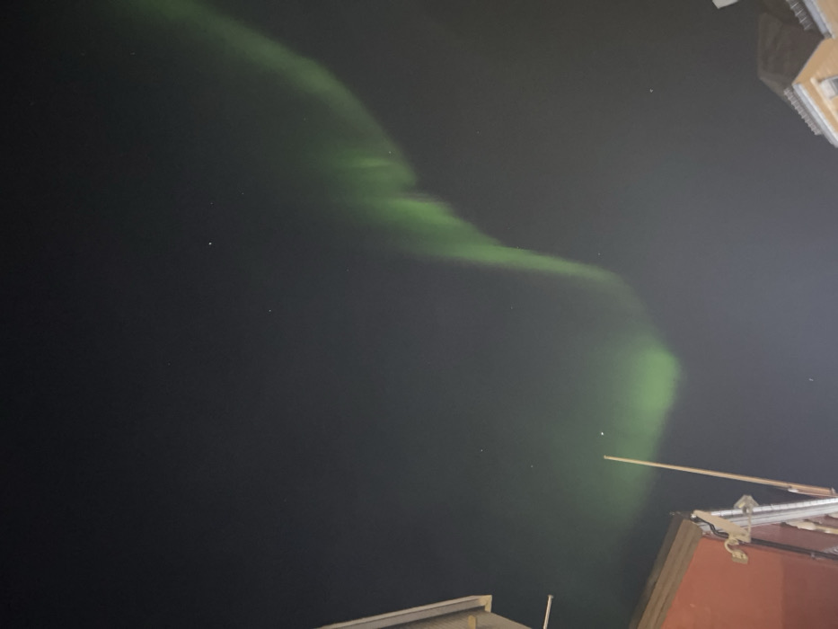 The image displays a nocturnal urban scene in Tromsø, Norway. A prominent, undulating band of green Aurora Borealis stretches across the dark night sky, extending diagonally from the lower-left to the upper-right. Faint stars are discernible. In the lower-left quadrant, a section of a building featuring a reddish-brown wall and a light-colored roof fascia is visible, from which a thin, vertical pole extends upwards. The lower-right quadrant shows the upper facade and roof edge of a different building, characterized by a light-toned exterior. No individuals or explicit actions are observed within the frame. Ambient light sources are minimal, consisting primarily of the aurora and distant artificial illumination.