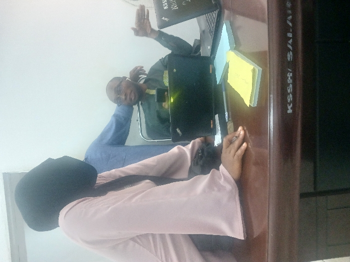 An indoor scene in an office within Lokoja, Nigeria, depicts three individuals engaged in a discussion around a dark brown wooden desk