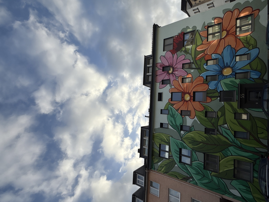 The image depicts the facade of a multi-story residential building located at Alleestraße 55 in Remscheid, Germany, under a partly cloudy sky. The building's light greenish-blue exterior is extensively covered by a large, colorful mural featuring stylized flora. Large green leaves interweave with several prominent flowers, including an orange bloom on the left, a pink one near the top center, and a blue one positioned towards the bottom right. Additional smaller orange flowers are visible on the right. The mural incorporates numerous dark-framed rectangular windows of varying sizes, which are interspersed throughout the design and reflect portions of the sky and surrounding environment. At the base of the building, centrally located, is a dark main entrance with the building number "55" prominently displayed above it in white lettering. To the immediate left, a portion of an adjacent, lighter-colored building with dark-framed windows and a pitched roof is visible. The sky above is characterized by a mix of blue patches and scattered white and gray cumulus clouds. The tops of dark-colored vehicles are discernible at the bottom foreground, parked along the street in front of the building. No individuals or explicit actions are present within the frame.