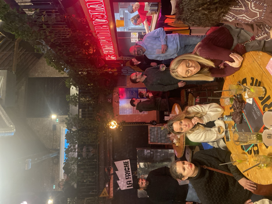 A group of people are gathered around wooden tables at an outdoor venue, likely a bar or restaurant. Many have drinks in front of them, with some appearing to be cocktails. The venue is decorated with greenery and illuminated by strung lights, giving it a lively atmosphere. Behind the tables, there are more people gathered, with a food counter visible in the background.